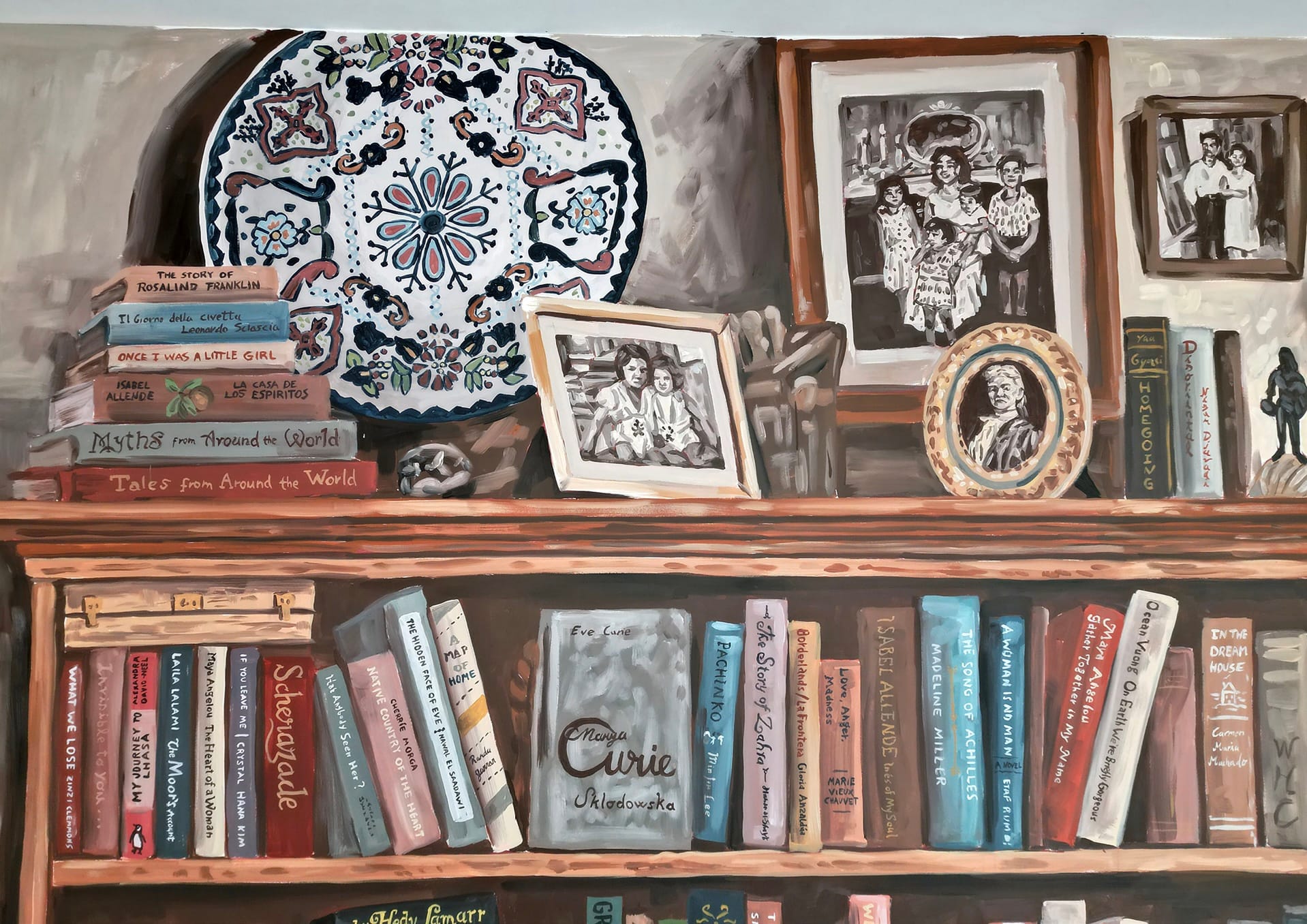 To shape the visual language of the mural, Mariana engaged directly with women whose lives had been touched by migration. During her time in Antwerp, she facilitated three workshops with students and staff from the linguistics department. These sessions opened up spaces for conversation around migration, identity, representation, and media portrayals. She asked participants to bring an object that told part of their migration story — something meaningful, symbolic, or simply something they missed. These objects, and the stories they held, became integral elements of the final image. They were layered into the mural alongside others drawn from conversations she had with women in my own personal and professional life — friends, artists, researchers, and mothers whose families had also crossed borders. She was also drawn to the often-overlooked stories of women migrants who have made lasting contributions to society — in the arts, sciences, sports, and other fields. To acknowledge these legacies, she included books and photographs referencing their lives and work. Since the mural was created on a university campus housing the linguistics department, it felt fitting to weave language and literature into the heart of the piece. Mariana painted the spines of 170 books across the bookshelf of this imagined room. These included titles in every language taught in the department — Dutch, English, French, Spanish, German, Italian, Polish, Russian, Arabic, and Flemish Sign Language.